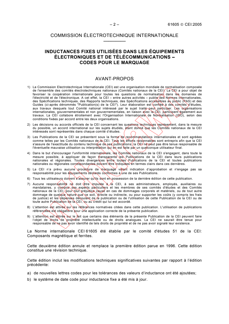 IEC 61605:2005 is a standard published by the International Electrotechnical Commission (IEC). Its full title is "Fixed inductors for use in electronic and telecommunication equipment - Marking codes". This standard covers: Specifies marking codes for fixed inductors. Covers the inductance values and their tolerances as well as dates.