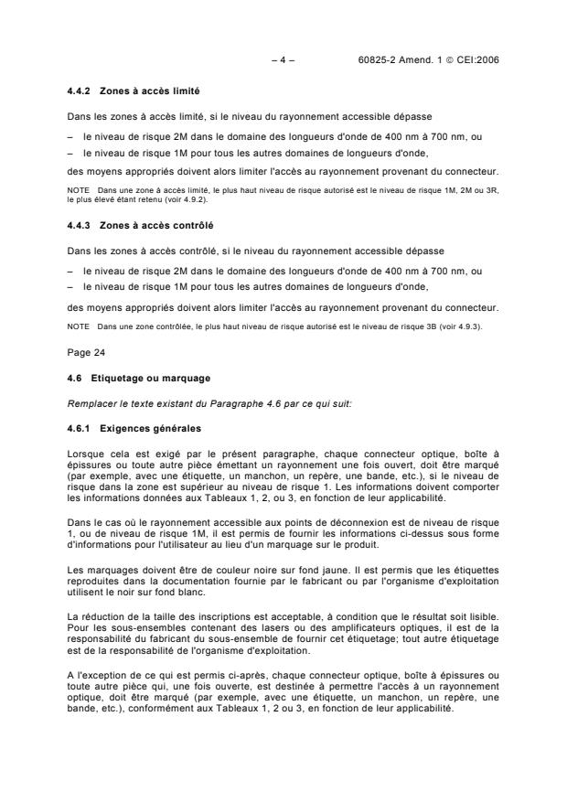 Updated paragraphs clarify the level of allowable radiation through optical fibre connectors depending on the access zone and hazard level. Means must be implemented to prevent direct exposure to hazardous laser radiation at connector points.Marking and Labeling Requirements