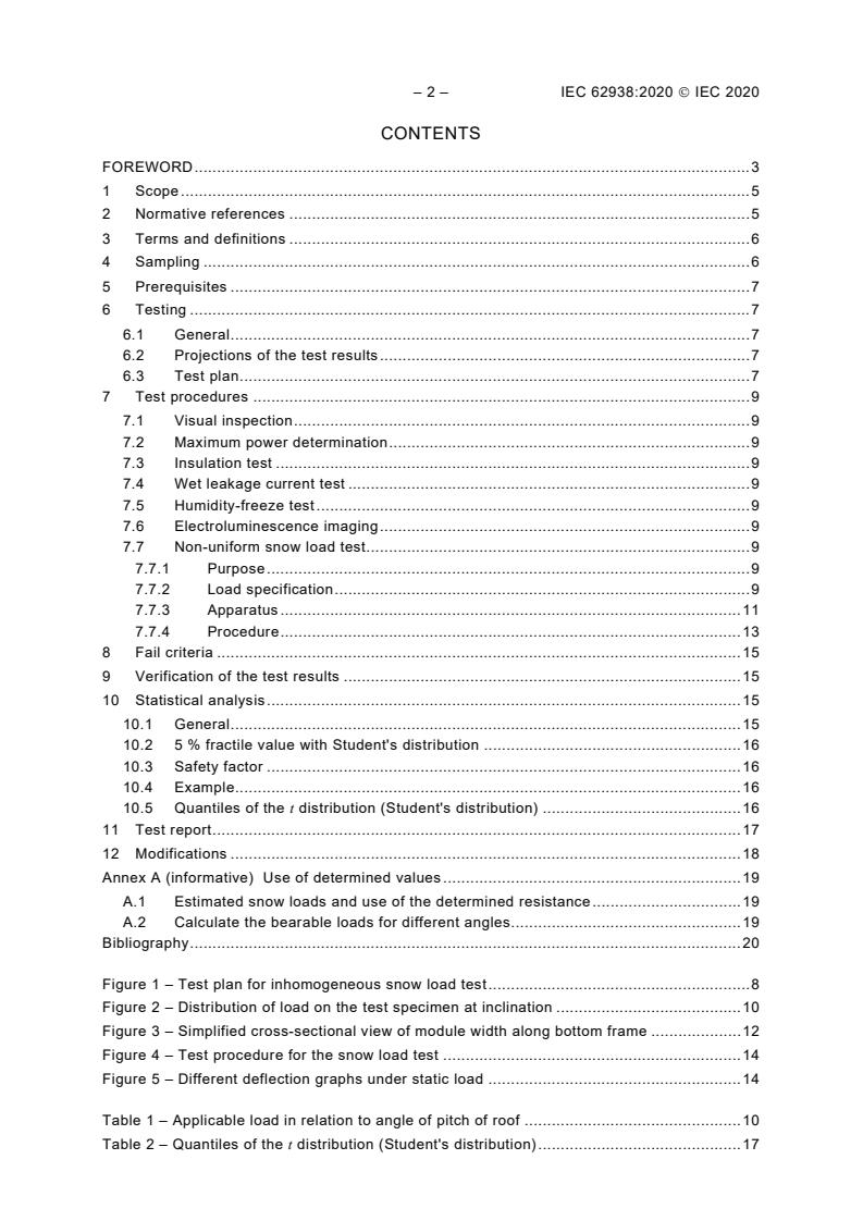 IEC 62938:2020 provides a method for determining how well a framed PV module performs mechanically under the influence of inclined non-uniform snow loads. This document is applicable for framed modules with frames protruding beyond the front glass surface on the lower edge after intended installation and as such creates an additional barrier to snow sliding down from modules. For modules with other frame constructions, such as backrails formed in frames, on the side edges, on the top edge and on the lower edge not creating an additional snow slide barrier, this document is not applicable. The test method determines the mechanical non-uniform-load limit of a framed PV module.