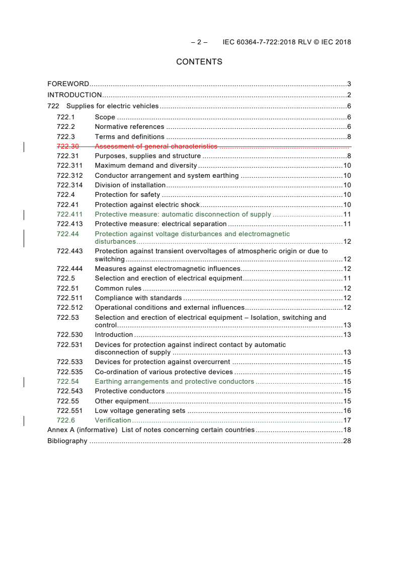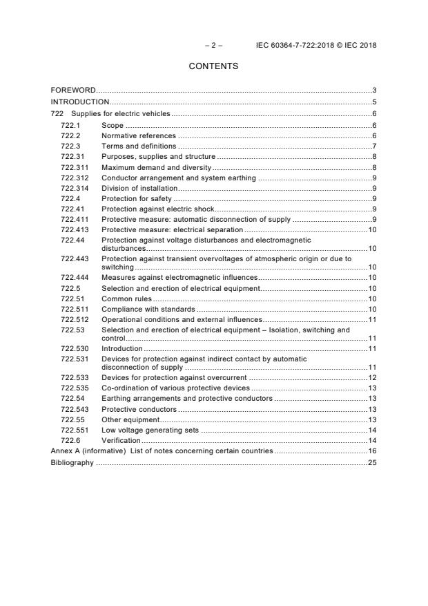 IEC 60364-7-722:2018 is a standard published by the International Electrotechnical Commission (IEC). Its full title is "Low-voltage electrical installations - Part 7-722: Requirements for special installations or locations - Supplies for electric vehicles". This standard covers: IEC 60364-7-722:2018 applies to: • circuits intended to supply energy to electric vehicles, and • circuits intended for feeding back electricity from electric vehicles. Circuits covered by this document are terminated at the connecting point. This edition includes the following significant technical changes with respect to the previous edition: a) introduction of requirements for electrical installations incorporating wireless power transfer systems; b) clarification of the requirements regarding the protective measure placing out of reach in order to allow the use of pantographs in areas accessible to the public; c) introduction of requirements covering the case where the EV may operate as a source in parallel with other sources. NOTE 1 The requirements for EV supply equipment for conductive charging and the relevant charging modes are described in IEC 61851 (all parts). The requirements for EV supply equipment for wireless power transfer are described in IEC 61980 (all parts). NOTE 2 IEC 60364-7-722 does not cover the assessment of the risk of explosion due to the possible production of hydrogen/other flammable gases during the battery recharging phase.
