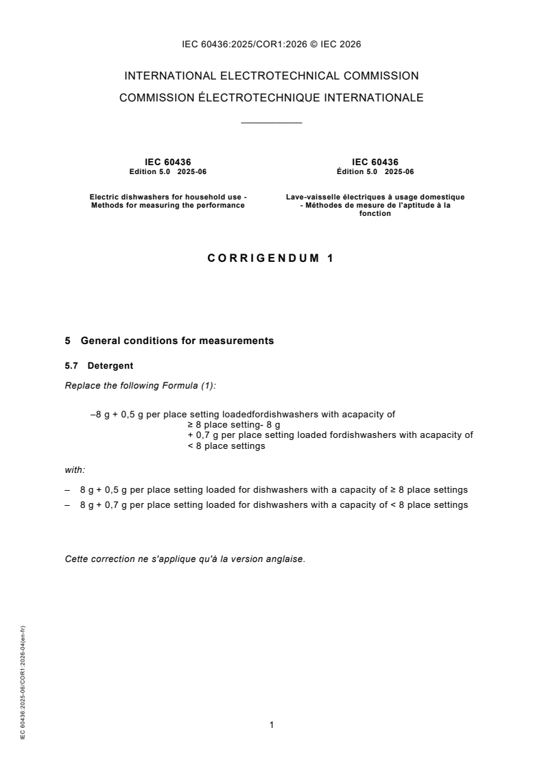 IEC 60436:2025/COR1:2026 is a standard published by the International Electrotechnical Commission (IEC). Its full title is "Corrigendum 1 - Electric dishwashers for household use - Methods for measuring the performance". This standard covers: Corrigendum 1 - Electric dishwashers for household use - Methods for measuring the performance