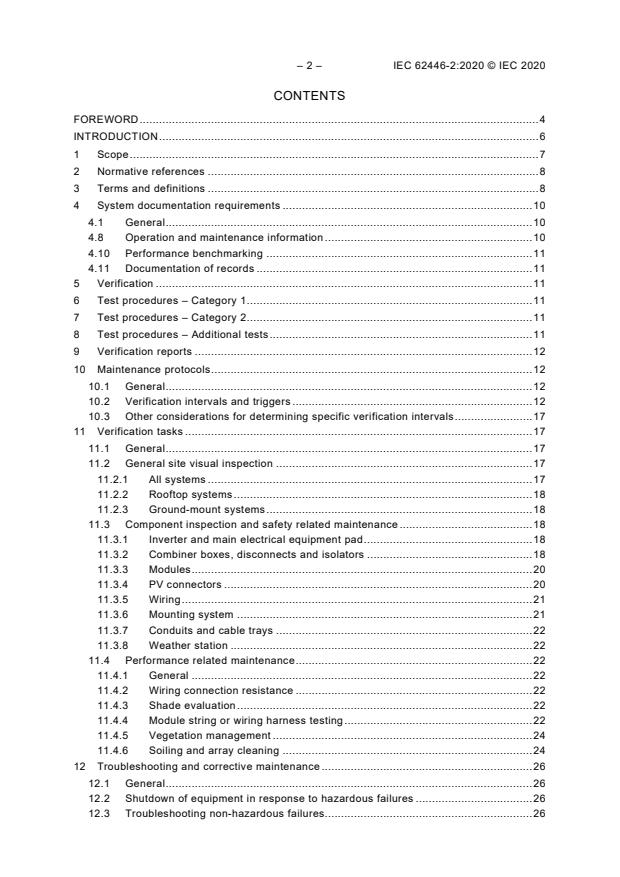 IEC 62446-2:2020 describes basic preventive, corrective, and performance related maintenance requirements and recommendations for grid-connected PV systems. The maintenance procedures cover: - Basic maintenance of the system components and connections for reliability, safety and fire prevention - Measures for corrective maintenance and troubleshooting - Worker safety This document also addresses maintenance activities for maximizing anticipated performance such as module cleaning and upkeep of vegetation. Special considerations unique to rooftop or ground-mounted systems are summarized.