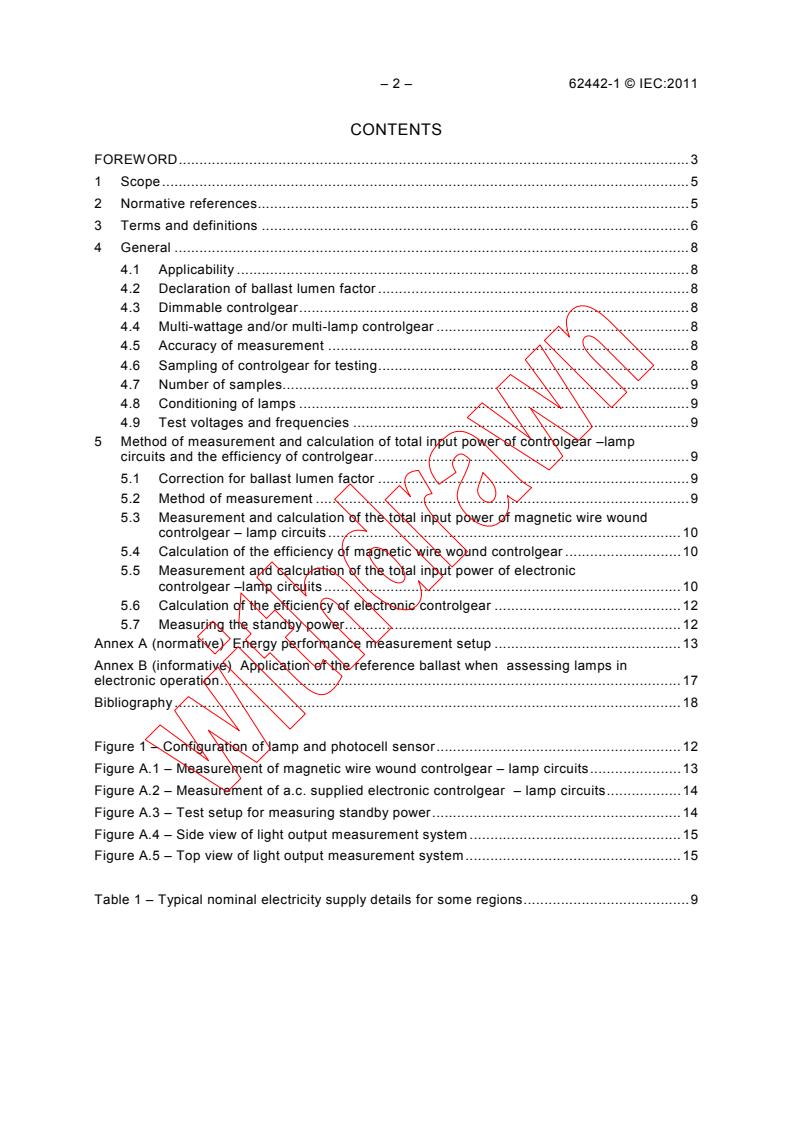 IEC 62442-1:2011 is a standard published by the International Electrotechnical Commission (IEC). Its full title is "Energy performance of lamp controlgear - Part 1: Controlgear for fluorescent lamps - Method of measurement to determine the total input power of controlgear circuits and the efficiency of the controlgear". This standard covers: IEC 62442-1:2011 defines a measurement and calculation method of the total input power for controlgear - lamp circuits when operating with their associated fluorescent lamp(s). The calculation method for the efficiency of the lamp controlgear is also defined. This International Standard applies to electrical controlgear lamp circuits consisting only of the controlgear and the lamp(s). It is intended for use on a.c. supplies up to 1 000 V at 50 Hz or 60 Hz.