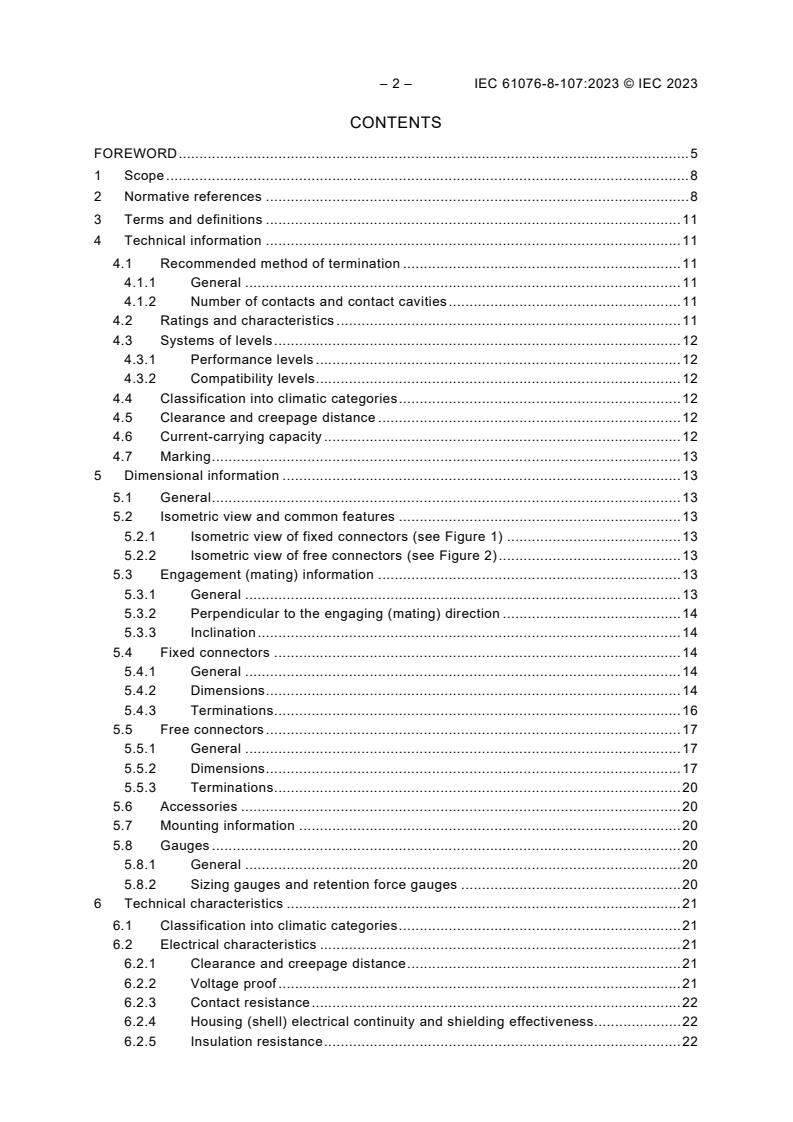 IEC 61076-8-107:2023 describes free and fixed rectangular connectors with: - 2P power plus 2P signal contacts; - plastic housing with locking lever and four possible codings; - 200 A rated current, 1 000 V DC rated voltage on the power section; - 5 A rated current, 50 V DC rated voltage on the signal section; - individual shielding around each power contact with relevant shielding termination; - IP65/IP68 degree of protection when mated and locked, and IPXXB on both plug and receptacle parts when unmated; - hereinafter referred to as a connector, for use in electrical and electronic equipment, including overall dimensions, interface dimensions, technical characteristics, performance requirements and test methods.