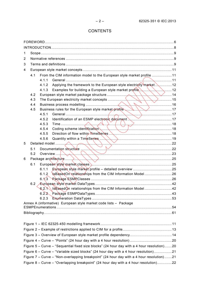 IEC 62325-351:2013 is a standard published by the International Electrotechnical Commission (IEC). Its full title is "Framework for energy market communications - Part 351: CIM European market model exchange profile". This standard covers: IEC 62325-351:2013 specifies a UML package which provides a logical view of the functional aspects of European style market management within an electricity markets. This package is based on the common information model (CIM). The use of the CIM goes far beyond its application in a market management system.