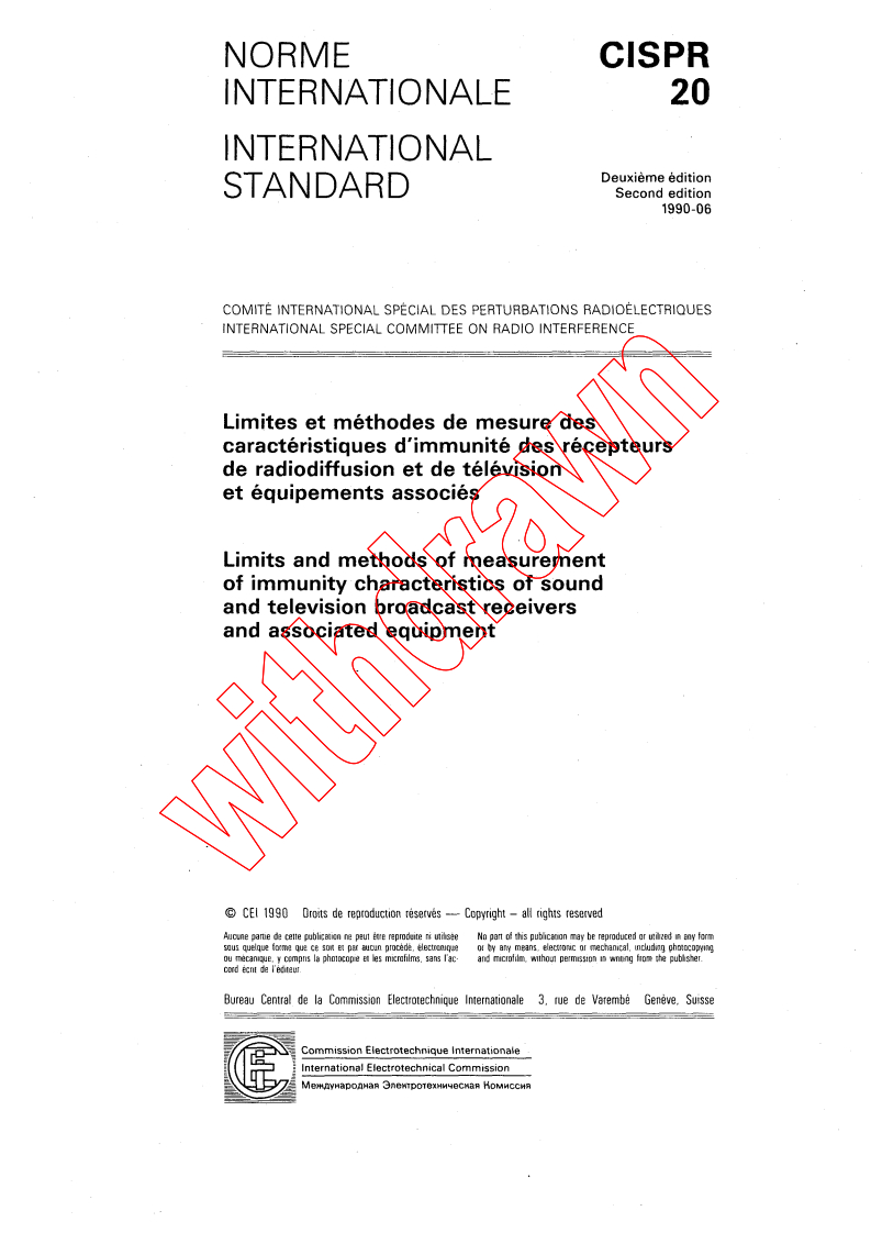 CISPR 20:1990 - Limits and methods of measurement of immunity characteristics of sound and television broadcast receivers and associated equipment. Released:7/15/1990 Isbn:2831818001