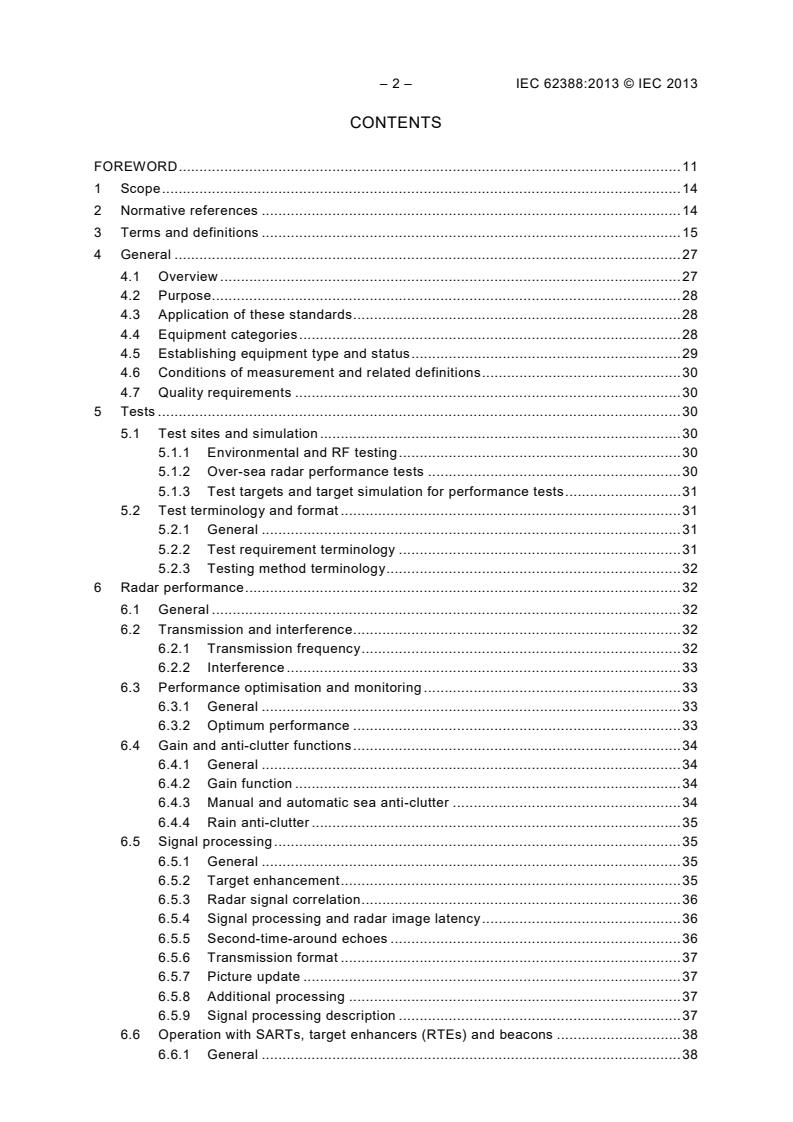 IEC 62388:2013 specifies the minimum operational and performance requirements, methods of testing and required test results conforming to performance standards not inferior to those adopted by the IMO in Resolution MSC.192(79). (MSC.192/2) The radar installation, in addition to meeting the general requirements as set out in resolution A.694(17) and the related standard IEC 60945, should comply with the performance standards of MSC.192(79). When a requirement of this standard is different from IEC 60945, the requirement in this standard takes precedence. This second edition cancels and replaces the first edition published in 2007. This edition constitutes a technical revision. The contents of the corrigendum of February 2014 have been included in this copy.
