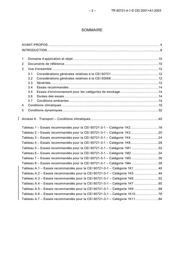 IEC 60721-4-1:2001+A1:2003 Traite de la corrélation et de la transformation des conditions de la CEI 60721-3-1 en essais d'environnement définis dans la CEI 60068-2. Un environnement peut être constitué d'un certain nombre de conditions d'environnement telles que les conditions dynamiques, climatiques et biologiques ainsi que d'autres effets dus aux substances chimiquement et mécaniquement actives. Dans ce rapport, seules les conditions dynamiques et climatiques sont prises en considération.