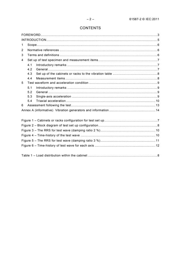 IEC 61587-2:2011 specifies seismic tests for cabinets and racks accommodated with IEC 60917 and 60297 series. It applies, in whole or in part, only to the mechanical structures of cabinets and racks for electronic equipment according to the above cited series of standards, while it does not apply to the electronic equipment or systems deemed to be installed within these mechanical structures. This standard does not apply either to a cabinet or a rack having an anti-seismic isolation structure, either external or internal. This standard aims to provide test conditions and criteria that constitute a reference to evaluate the ability of the mechanical structure of the cabinets or racks to acceptably withstand specified seismic intensities. For this purpose, this standard specifies test specimen conditions, such as dimensions (i.e. height, width and depth) of the cabinet and the rack, load distribution, structural test condition and the RRS (required response spectra) of single-axis or tri-axis acceleration as the seismic test wave condition. The single-axis or tri-axis acceleration is selectable. The second edition of this standard replaces the first edition published in 2000 and constitutes a technical revision. The main technical changes with regard to the previous edition are as follows: Edition 1.0 specified the test condition with one size of the cabinet, and one load distribution. The specified acceleration condition for the test specimen was single-axis and one of the RRS (required response spectra) specified in the standard was selected. The test was aimed to obtain the reference for the structural strength of the enclosure against the specified seismic intensity. Earthquakes are actually random phenomena that are much more carefully simulated by tri-axial simultaneous operation. The demand of tri-axial excitation has emerged as a more accurate representation of an earthquake.
