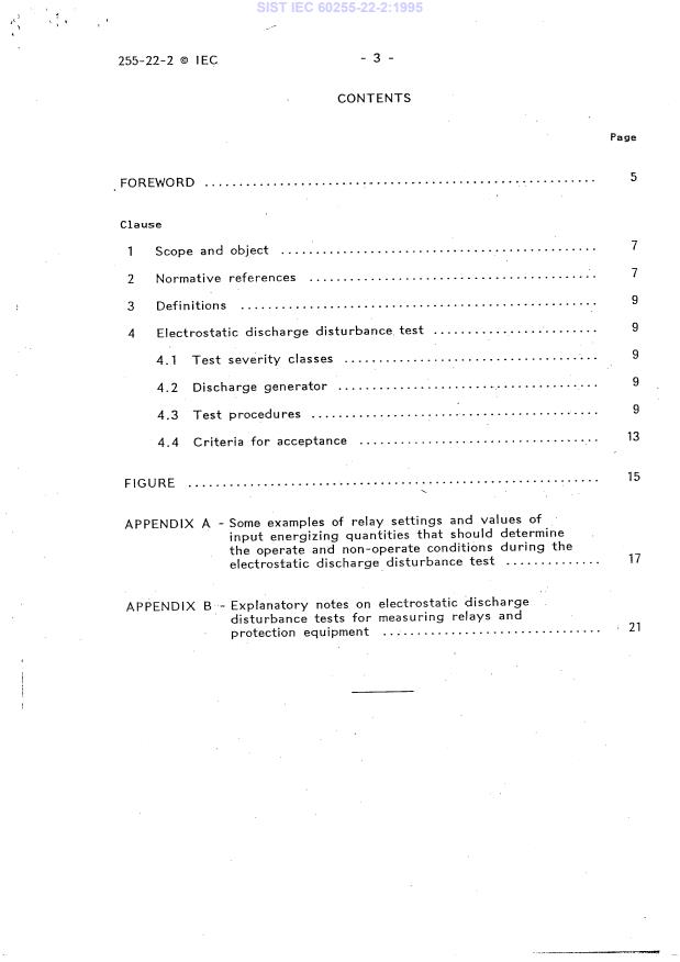La CEI 60255-22-2:2008 spécifie les exigences générales pour les essais de décharges électrostatiques des relais de mesure et des dispositifs de protection pour la protection des systèmes électriques, incluant les équipements de contrôle, de commande, et des interfaces procédés utilisés dans ces systèmes. Elle se base sur la CEI 61000-4-2. L'objet de ces essais est de confirmer qu'une fois mis sous tension et soumis à des décharges électrostatiques, les équipements testés fonctionneront correctement. Les modifications principales par rapport à l'édition précédente sont l'amélioration du niveau de sévérité de l'essai, du montage de l'essai et du rapport d'essai.
