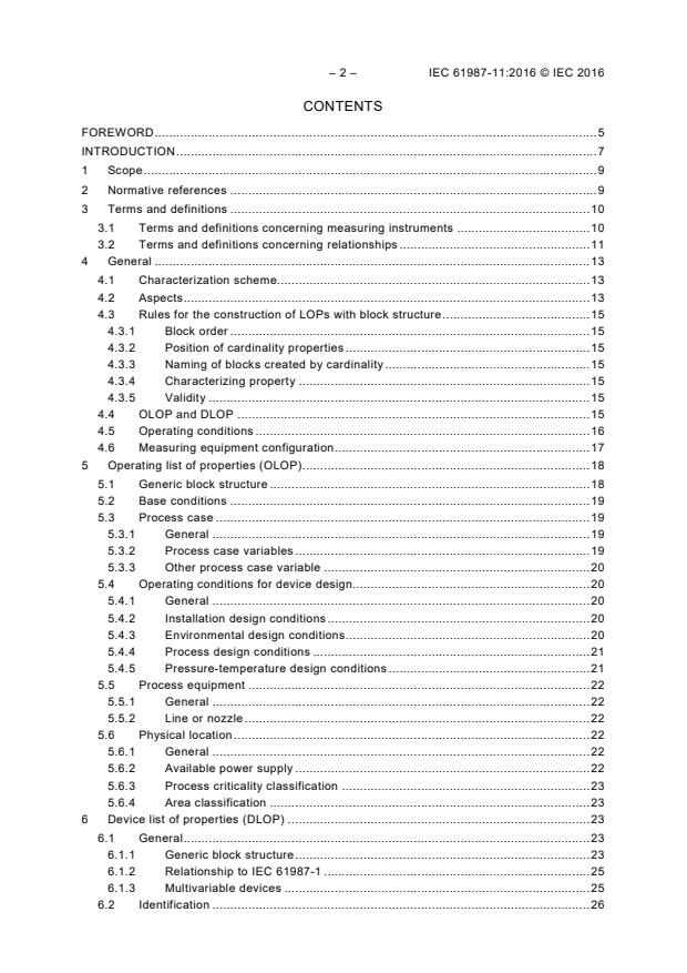 IEC 61987-11:2016 is a standard published by the International Electrotechnical Commission (IEC). Its full title is "Industrial-process measurement and control - Data structures and elements in process equipment catalogues - Part 11: List of properties (LOPs) of measuring equipment for electronic data exchange - Generic structures". This standard covers: IEC 61987-11:2016 provides: - a characterisation of industrial process measuring equipment (device type dictionary) for integration in the Common Data Dictionary (CDD), and - generic structures for operating lists of properties (OLOP) and device lists of properties (DLOP) of measuring equipment in conformance with IEC 61987-10. This second edition cancels and replaces the first edition published in 2012. This edition constitutes a technical revision. This edition includes the following significant technical changes with respect to the previous edition: a) The classification in Table A.1 has been amended to reflect the changes in the classification scheme of process measuring equipment in the CDD due to the development of IEC 61987-14, IEC 61987-15 and IEC 61987-16. b) Annex A has become “informative”.