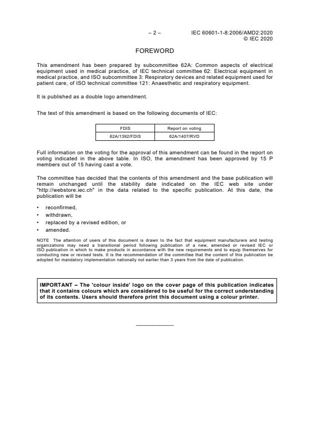 IEC 60601-1-8:2006/AMD2:2020 is a standard published by the International Electrotechnical Commission (IEC). Its full title is "Amendment 2 - Medical electrical equipment - Part 1-8: General requirements for basic safety and essential performance - Collateral Standard: General requirements, tests and guidance for alarm systems in medical electrical equipment and medical electrical systems". This standard covers: Amendment 2 - Medical electrical equipment - Part 1-8: General requirements for basic safety and essential performance - Collateral Standard: General requirements, tests and guidance for alarm systems in medical electrical equipment and medical electrical systems