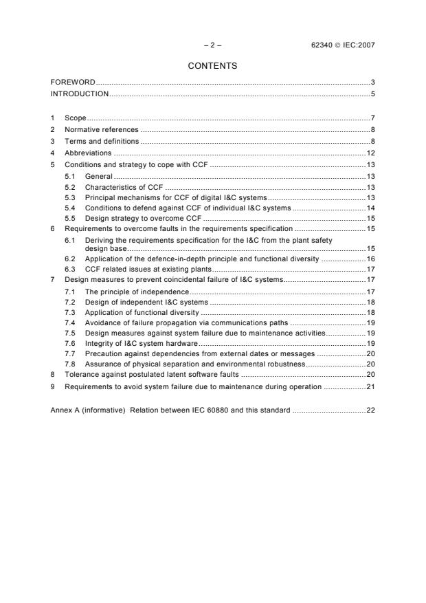 IEC 62340:2007 is a standard published by the International Electrotechnical Commission (IEC). Its full title is "Nuclear power plants - Instrumentation and control systems important to safety - Requirements for coping with common cause failure (CCF)". This standard covers: Gives requirements related to the avoidance of CCF of I&C systems that perform category A functions; additionally requires the implementation of independent I&C systems to overcome CCF, while the likelihood of CCF is reduced by strictly applying the overall safety principles of IEC SC 45A (notably IEC 61226, IEC 61513, IEC 60880 and IEC 60709); gives an overview of the complete scope of requirements relevant to CCF.