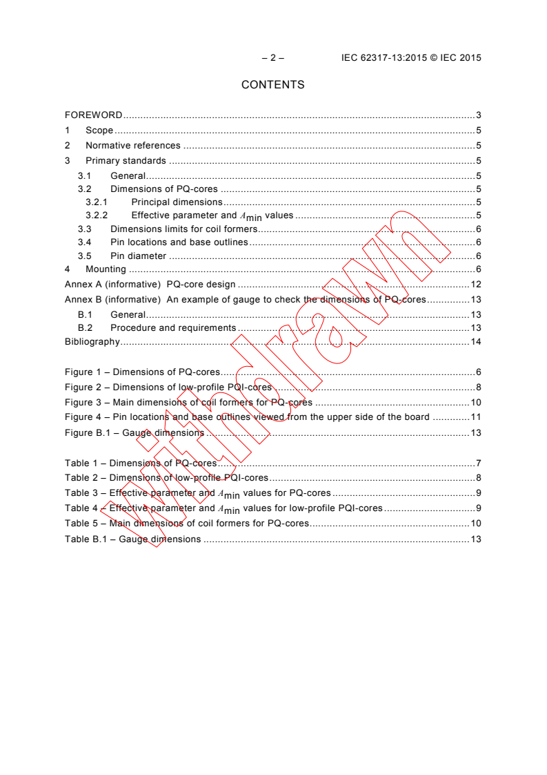 IEC 62317-13:2015 specifies the dimensions that are of importance for mechanical interchangeability for a preferred range of PQ-cores and low-profile PQI-cores made of ferrite, and the locations of their terminal pins on a 2,54 mm printed wiring grid in relation to the base outlines of the cores. The selection of core sizes for this standard is based on the philosophy of including those sizes which are industrial standards, either by inclusion in a national standard, or by broad-based use in industry. This edition includes the following significant technical changes with respect to the previous edition: a) addition of three core sizes (PQ 65/54, PQ 78/39 and PQ 107/87) in Table 1; b) addition of effective parameter and Amin values, of main dimensions of coil formers and of gauge dimensions for PQ-cores for PQ 65/54, PQ 78/39 and PQ 107/87.