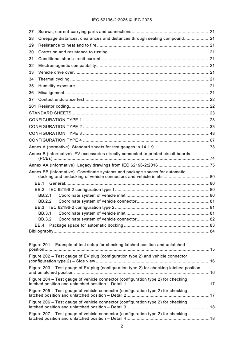 IEC 62196-2:2025 is a standard published by the International Electrotechnical Commission (IEC). Its full title is "Plugs, socket-outlets, vehicle connectors and vehicle inlets - Conductive charging of electric vehicles - Part 2: Dimensional compatibility requirements for AC pin and contact-tube accessories". This standard covers: IEC 62196-2:2025 applies to EV plugs, EV socket-outlets, vehicle connectors and vehicle inlets with pins and contact-tubes of standardized configurations, herein referred to as "accessories". These accessories have a nominal rated operating voltage not exceeding 480 V AC, 50 Hz to 60 Hz, and a rated current not exceeding 63 A three phase or 70 A single phase, for use in conductive charging of electric vehicles. This fourth edition cancels and replaces the third edition published in 2022. This edition constitutes a technical revision. This edition includes the following significant technical changes with respect to the previous edition: a) addition of new tests for latching devices; b) corrections to standard sheets.