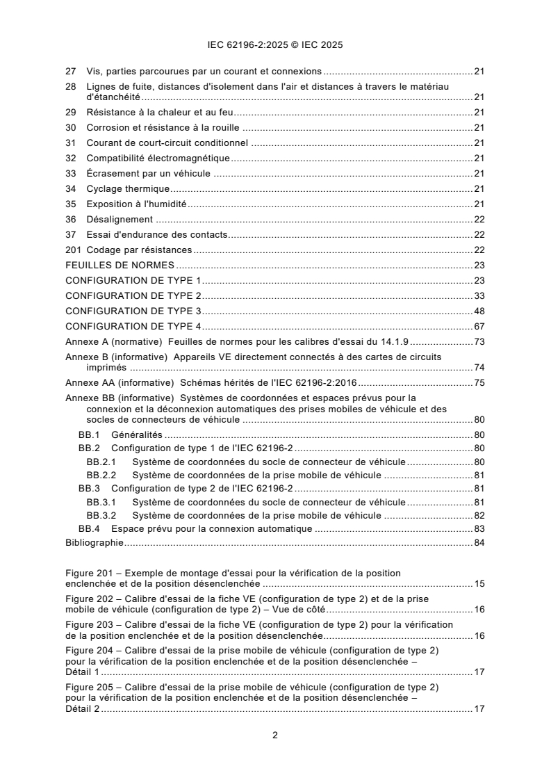 L'IEC 62196-2:2025 s'applique aux fiches VE, aux socles de prise de courant VE, aux prises mobiles de véhicule et aux socles de connecteurs de véhicule, à broches et alvéoles, de configurations normalisées, ci-après dénommés "appareils". Ces appareils ont une tension d'emploi assignée nominale qui ne dépasse pas 480 V en courant alternatif, de 50 Hz à 60 Hz, et un courant assigné qui ne dépasse pas 63 A en triphasé ou 70 A en monophasé, et sont destinés à la charge conductive des véhicules électriques.