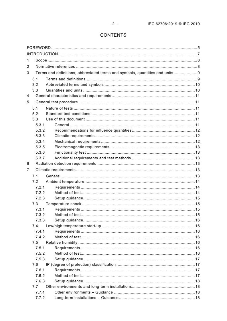 IEC 62706:2019 recommends the climatic, mechanical and electromagnetic performance requirements and methods of test for radiation protection instrumentation. This document also provides guidance regarding the setup of test equipment and instruments under test (IUT) for certain tests. The object of this document is to define, for design and test purposes, the environments in which radiation protection instrumentation may be exposed. The environments addressed by this document are applicable to body-worn (e.g., personal radiation detectors, backpack, and dosemeters), handheld, transportable, mobile, and installed instrumentation. This second edition cancels and replaces the first edition, issued in 2012. This edition includes the following significant technical changes with respect to the previous edition: a) addition of more details to selected methods of test; b) revised radio frequency testing requirements based on measurements made at various locations; c) added equipment and instrument setup guidance and recommendations.