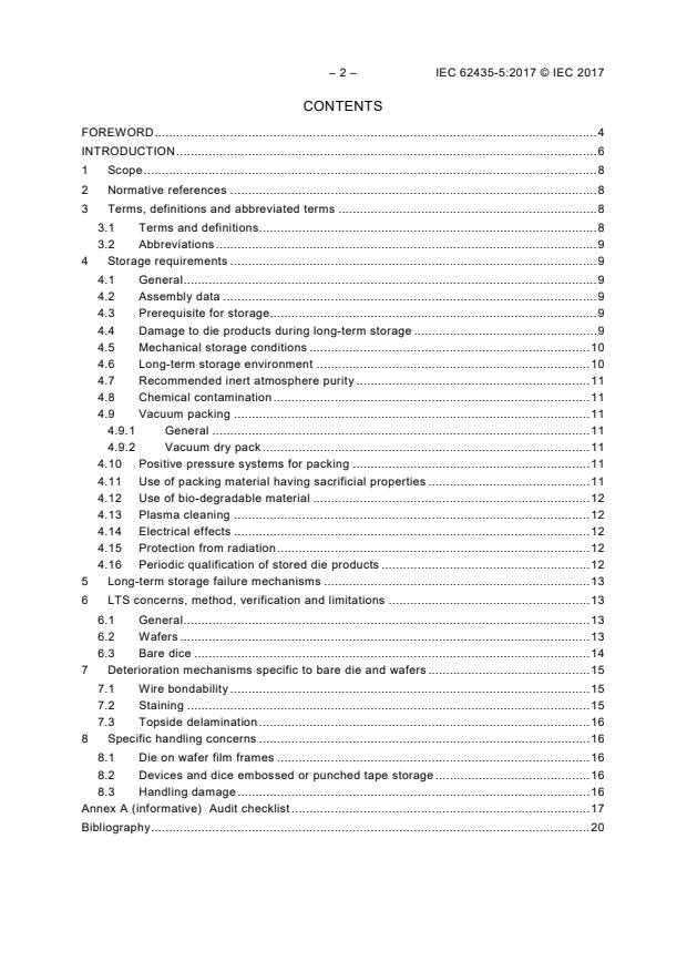 IEC 62435-5:2017 is applicable to long-term storage of die and wafer devices and establishes specific storage regimen and conditions for singulated bare die and partial or complete wafers of die including die with added structures such as redistribution layers and solder balls or bumps or other metallisation. This part also provides guidelines for special requirements and primary packaging that contain the die or wafers for handling purposes. Typically, this part is used in conjunction with IEC 62435-1:2017 for long-term storage of devices whose duration can be more than 12 months for products scheduled for long duration storage.