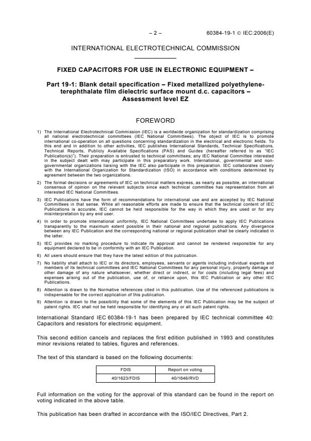 IEC 60384-19-1:2006 is a standard published by the International Electrotechnical Commission (IEC). Its full title is "Fixed capacitors for use in electronic equipment - Part 19-1: Blank detail specification - Fixed metallized polyethylene-terephthalate film dielectric surface mount d.c. capacitors - Assessment level EZ". This standard covers: is a supplementary document to the sectional specification and contains requirements for style and layout and minimum content of detail specifications. Detail specifications not complying with these requirements may not be considered as being in accordance with IEC specifications nor shall they so be described.