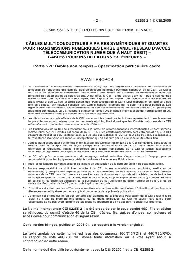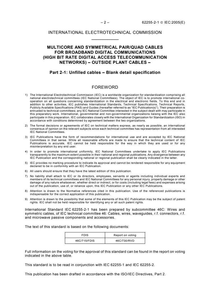 IEC 62255-2-1:2005 is an IEC blank detail specification for multicore and symmetrical pair/quad unfilled outside-plant cables used in broadband digital communications (high bit rate digital access telecommunication networks). Rather than prescribing a single cable design, it defines the layout, style and required information fields that national bodies, manufacturers or users should complete when preparing a formal detail specification for an unfilled cable type.