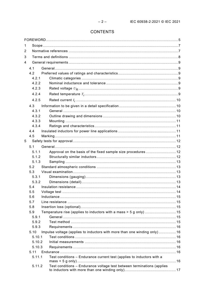 IEC 60938-2:2021 applies to fixed inductors designed for electromagnetic interference suppression, which will be connected to an AC mains or other supply with a nominal voltage not exceeding 1 000 V AC RMS or 1 500 V DC with a nominal frequency not exceeding 400 Hz. This sectional specification is restricted to fixed inductors for which safety tests are appropriate. This implies that inductors specified according to this specification will either be connected to mains supplies, when compliance with the mandatory tests of Annex A is necessary, or used in other circuit positions where the equipment specification prescribes that some or all of these safety tests are required. The object of this document is to prescribe standard requirements for safety tests, preferred ratings and characteristics, to select from IEC 60938-1 the appropriate methods of test and to give general performance requirements for suppression inductors. This edition includes the following significant technical changes with respect to the previous edition: - the test plan for performance testing has been removed; mandatory safety tests and optional performance tests are listed in one test plan in Annex B; - requirements for Thyristor-Chokes have been withdrawn; - material requirements are harmonized with IEC 60939-3 and UL 60939-3; - AC chokes up to 1 000 V and DC chokes up to 1 500 V are now in the Scope.