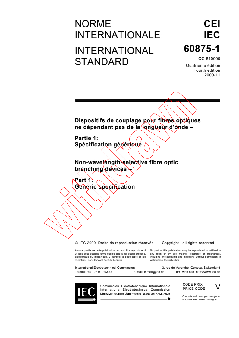 IEC 60875-1:2000 is an international standard published by the International Electrotechnical Commission (IEC) that provides the generic specification for non-wavelength-selective fibre optic branching devices. This standard applies to passive fibre optic devices featuring three or more ports that allow optical power to enter and exit, distributing it among the ports in a predetermined way. These devices do not rely on wavelength selectivity, meaning they handle optical signals without filtering based on wavelength.