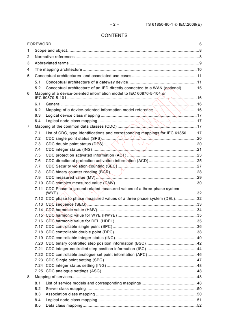 IEC TS 61850-80-1:2008 is a Technical Specification from the International Electrotechnical Commission (IEC) that provides a guideline for exchanging information from a CDC‑based data model (for example IEC 61850) using IEC 60870‑5‑101 or IEC 60870‑5‑104. The document describes a standardized mapping approach to translate device‑oriented models (logical devices, logical nodes, Common Data Classes - CDCs) and services onto the ASDU types and services defined by IEC 60870‑5 series, enabling interoperability between substations and control centers.