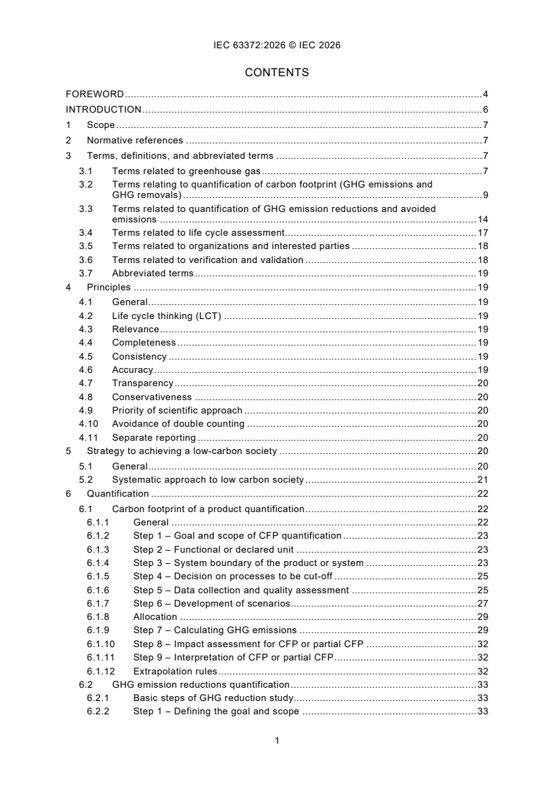 IEC 63372:2026 describes principles and methodologies, specifies requirements and provides guidance for quantification and communication of carbon footprint a product (CFP), emission reductions and avoided emissions from electric and electronic (EE) products and systems. This document is also applicable to product-related GHG projects. The GHG quantification such as CFP is based on life cycle assessment (LCA) methods. This document is a basic environment horizontal publication focusing on essential requirements and is primarily intended for use by committees in the preparation of publications within the area of environment in accordance with the principles laid down in IEC Guide 123. Wherever applicable, it is the responsibility of committees to make use of environment basic publications in the preparation of their environment group and product publications. Committees can apply this document directly to products when they do not develop a product publication in the area of environment. This first edition of IEC 63372 cancels and replaces IEC TR 62725:2013 and IEC TR 62726:2014, which have been technically revised. This edition includes the following significant technical changes with respect to the previous edition: a) updating and enhancing content related to carbon footprint of a product to align with new or updated reference standards; b) including product and system in quantification of GHG emission reductions; c) adding the content related to avoided emissions including use cases in Annex D.