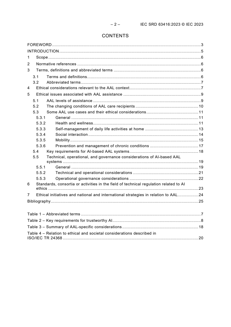 IEC SRD 63416:2023 provides ethical guidance specifically for the use of artificial intelligence (AI) in Active Assisted Living (AAL) systems and services. It supplements existing high‑level AI ethics frameworks (WHO, OECD, EU HLEG, etc.) by analysing AAL‑specific risks and by turning ethical assessment into concrete, actionable guidelines and checklists for system and service platform design, development and implementation. The document focuses on protecting AAL care recipients as they age and on ensuring AI systems behave appropriately as physical, cognitive and social needs change.