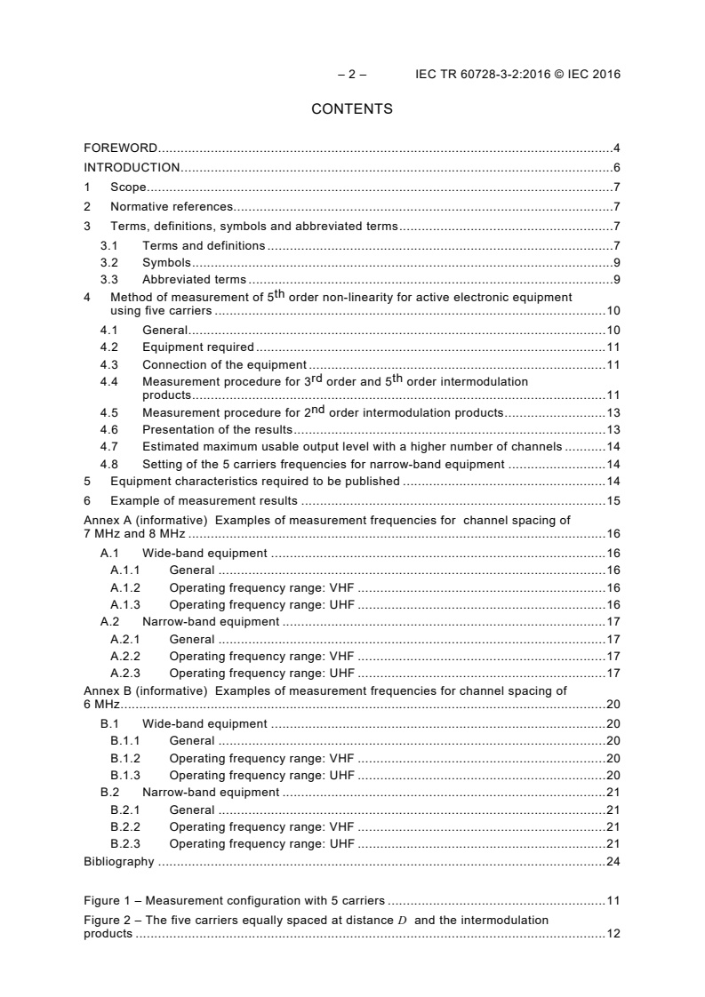 IEC TR 60728-3-2:2016(E) is applicable to the measurement of 5th order non-linearity for active electronic equipment which carries only digitally modulated television signals, sound signals and signals for interactive services. This method of measurement is specifically applicable to MATV installations but could be applied to broadband and channel selective amplifiers used in all kinds of cable networks.
