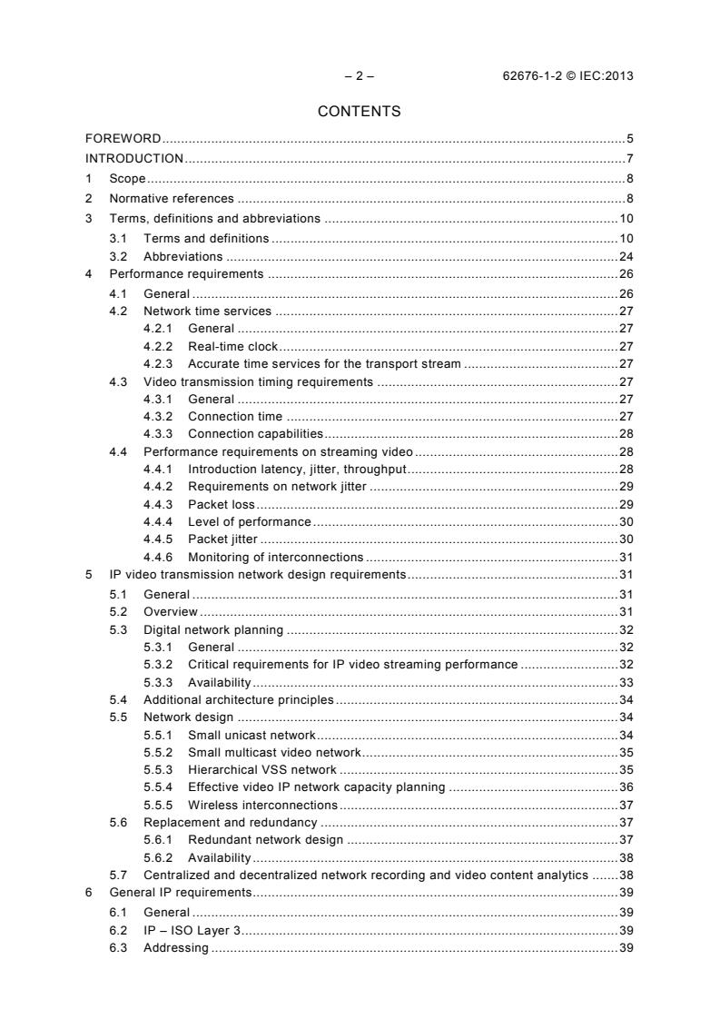 IEC 62676-1-2:2013 introduces general requirements on video transmission. This standard covers the general requirements for video transmissions on performance, security and conformance to basic IP connectivity, based on available, well-known, international standards.