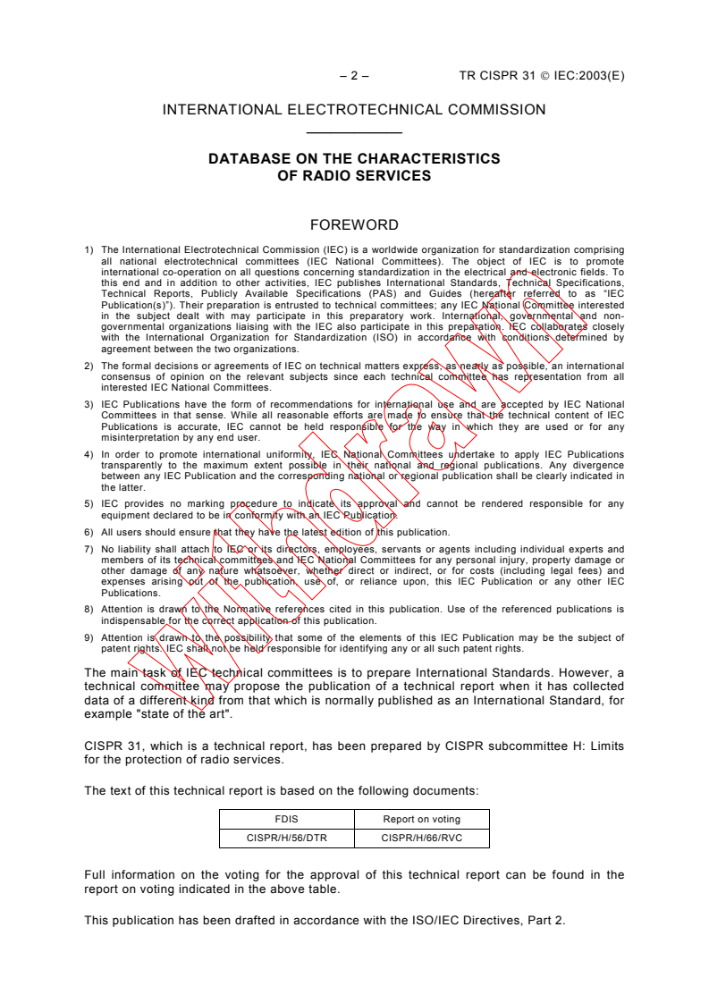 CISPR TR 31:2003 is a technical report published by the International Electrotechnical Commission (IEC). Its full title is "Database on the characteristics of radio services". This standard covers: This Technical Report covers the rationale behind the actual database covering the characteristics of radio services. The objective of the database is to register those characteristics which are relevant for derivation and specification of limits for disturbance emissions from electric and/or electronic equipment, systems and installations. Committees responsible for generic and/or product emission EMC standards should use this information together with CISPR 23.