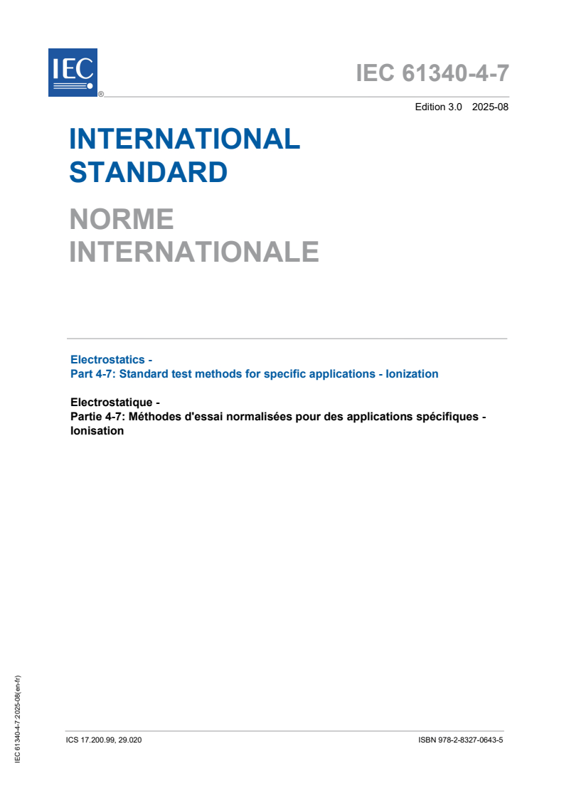 IEC 61340-4-7:2025 - Electrostatics - Part 4-7: Standard test methods for specific applications - Ionization Released:8/19/2025 Isbn:9782832706435