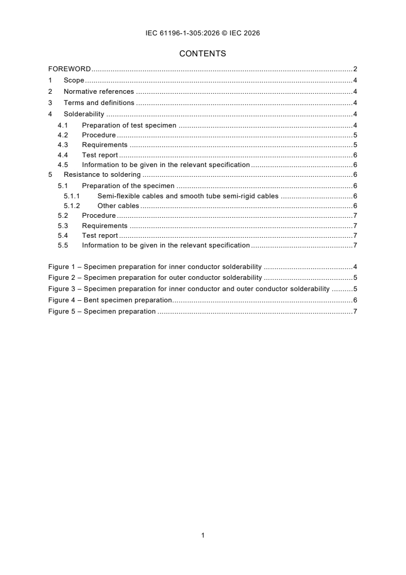 IEC 61196-1-305:2026 applies to coaxial communication cables. It specifies the test methods to determine solderability and the resistance to soldering of inner and outer conductors of cables used in analogue and digital communication systems. This second edition cancels and replaces the first edition published in 2015. This edition constitutes a technical revision. This edition includes the following significant technical changes with respect to the previous edition: a) 4.1 Preparation of test specimen was added; b) 4.2 Procedure, 4.3 Requirements and 4.4 Test report were revised; c) 4.5 Information to be given in the relevant specification was added; d) 5.1 Preparation of the specimen was added; e) 5.2 Procedure was revised; f) 5.5 Information to be given in the relevant specification was added; g) Figure 1 to Figure 5 were added.