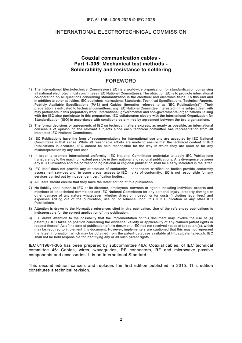 IEC 61196-1-305:2026 is a standard published by the International Electrotechnical Commission (IEC). Its full title is "Coaxial communication cables - Part 1-305: Mechanical test methods - Solderability and resistance to soldering". This standard covers: IEC 61196-1-305:2026 applies to coaxial communication cables. It specifies the test methods to determine solderability and the resistance to soldering of inner and outer conductors of cables used in analogue and digital communication systems. This second edition cancels and replaces the first edition published in 2015. This edition constitutes a technical revision. This edition includes the following significant technical changes with respect to the previous edition: a) 4.1 Preparation of test specimen was added; b) 4.2 Procedure, 4.3 Requirements and 4.4 Test report were revised; c) 4.5 Information to be given in the relevant specification was added; d) 5.1 Preparation of the specimen was added; e) 5.2 Procedure was revised; f) 5.5 Information to be given in the relevant specification was added; g) Figure 1 to Figure 5 were added.