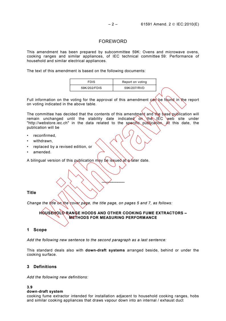IEC 61591:1997/AMD2:2010 - Amendment 2 - Household range hoods and other cooking fume extractors - Methods for measuring performance Released:7/28/2010