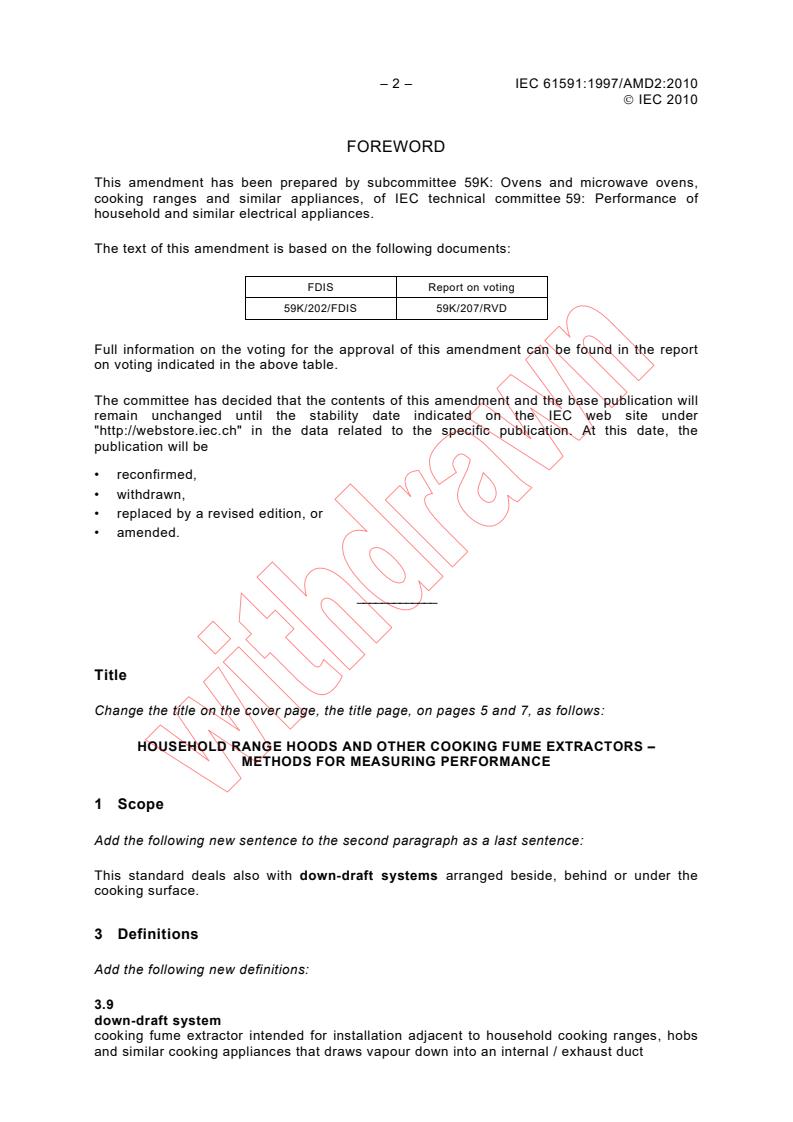 IEC 61591:1997/AMD2:2010 is Amendment 2 to the international standard for household range hoods and other cooking fume extractors - methods for measuring performance. The amendment extends the existing test methods to explicitly cover down‑draft systems, updates definitions for control settings (normal highest setting vs. boost), and clarifies measurement procedures for airflow, grease retention, odour removal and hob lighting.