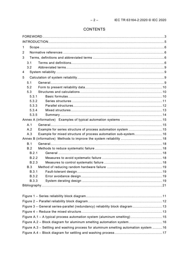IEC TR 63164-2:2020 provides guidance on the calculation of reliability data of automation systems which can be simplified as series, parallel or mixed structure based on reliability data of single devices and/or sub-systems, and on the form to present the data. NOTE This procedure is only targeted to the reliability of automation systems, but not systems that embed automation systems, e.g. process plant. Reliability is included in dependability, and this document is mainly focused on random hardware failures that affect reliability. Dependability is used as a collective term for the time-related quality characteristics of an item and additionally includes availability, recoverability, maintainability, maintenance support performance, and, in some cases, other characteristics such as durability, safety and security, which are all not in the scope of this Technical Report.