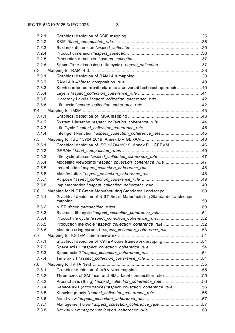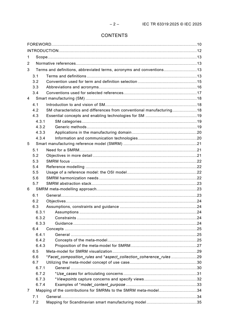 This TR complements major frameworks (RAMI 4.0, IIRA, NIST, GERAM) and supports harmonization across smart manufacturing standards. Relevant keywords: IEC TR 63319:2025, smart manufacturing reference model, meta‑modelling, SMRM, Industry 4.0, interoperability, reference models, life cycle, hierarchy, layers.