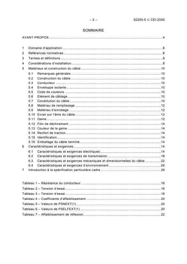 - Defines electrical, transmission (attenuation, return loss, NEXT, FEXT), mechanical/dimensional, and environmental requirements. Tabulated limits include conductor resistance, test voltages and transmission coefficients (PSNEXT, PSELFEXT, attenuation) referenced in the standard.