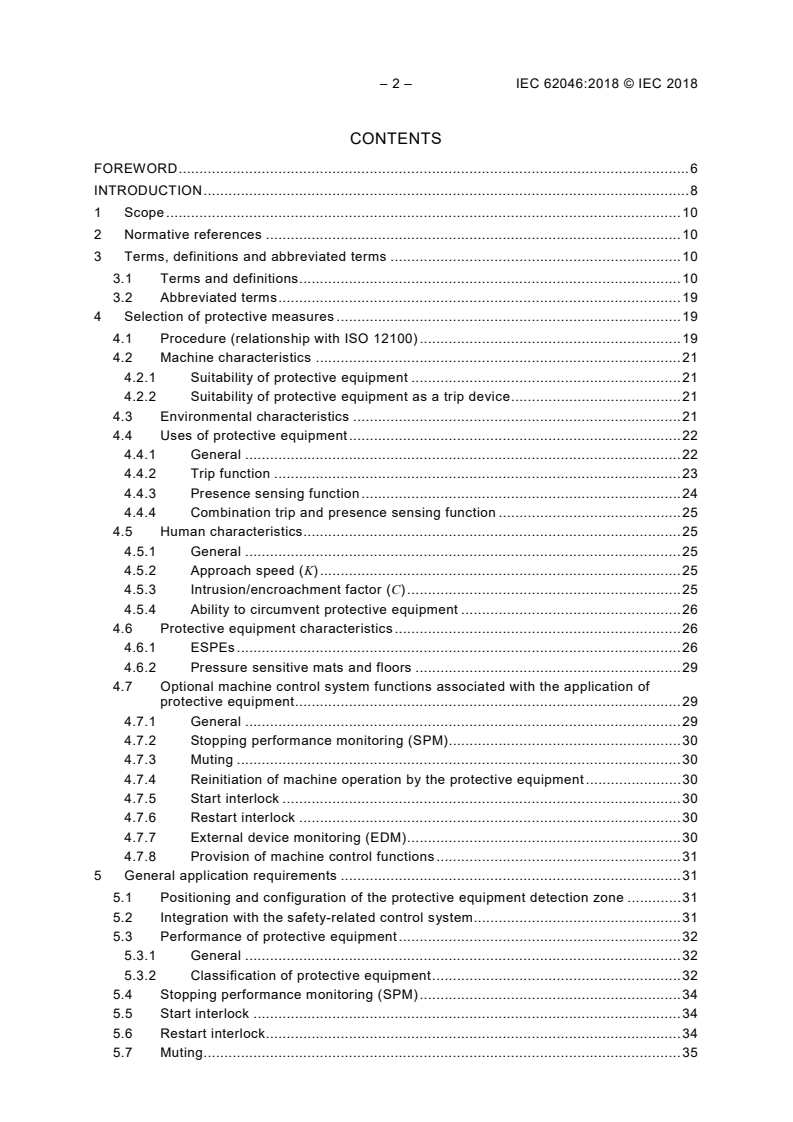 IEC 62046:2018 specifies requirements for the selection, positioning, configuration and commissioning of protective equipment to detect the momentary or continued presence of persons in order to protect those persons from dangerous part(s) of machinery in industrial applications. This standard covers the application of electro-sensitive protective equipment (ESPE) specified in IEC 61496 (all parts) and pressure sensitive mats and floors specified in ISO 13856-1.