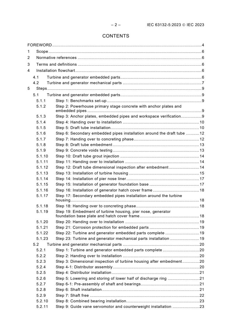 Keywords: IEC 63132-5:2023, bulb turbines, hydroelectric generator installation, hydroelectric machine installation, installation tolerances, turbine assembly procedures, hydropower standards, turbine mechanical parts, generator installation, draft tube tolerances, turbine commissioning.
