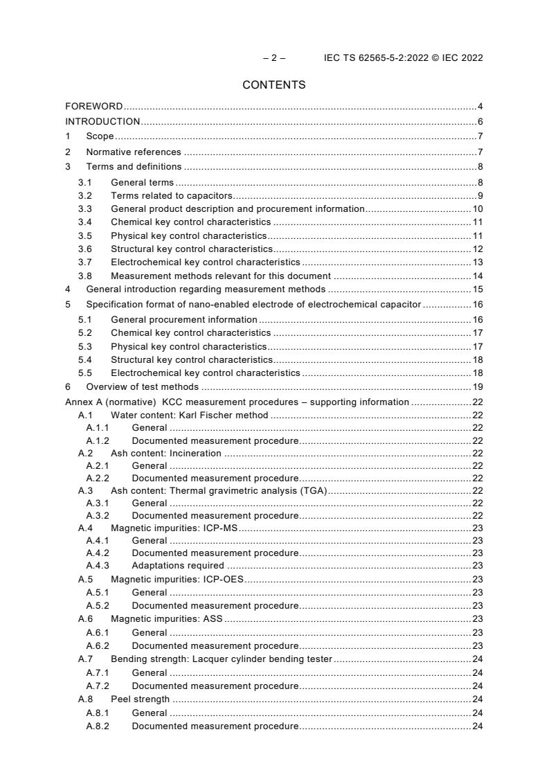 - Measurement methods: Annex A provides documented procedures or references for many tests (e.g., Karl Fischer titration, TGA, ICP methods, BET surface area, contact angle, capacitance and leakage test protocols).