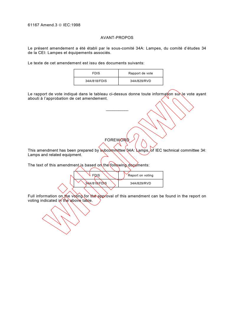 IEC 61167:1992/AMD3:1998 is an essential international standard amendment focused on metal halide lamps, developed by the International Electrotechnical Commission (IEC) Subcommittee 34A on Lamps and related equipment. This Amendment 3 updates the original IEC 61167:1992 standard to specify detailed technical requirements, lamp characteristics, and safety considerations for various types of metal halide lamps, including single-ended and double-ended designs. The amendment aims to ensure reliable performance, safety, and uniform quality across applications using metal halide lighting technology.