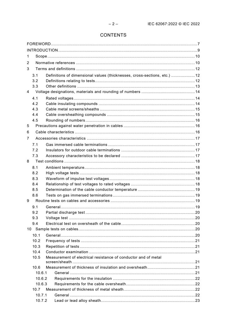 IEC 62067:2022 is a standard published by the International Electrotechnical Commission (IEC). Its full title is "Power cables with extruded insulation and their accessories for rated voltages above 150 kV (<em>U</em><sub>m</sub> = 170 kV) up to 500 kV (<em>U</em><sub>m</sub> = 550 kV) - Test methods and requirements". This standard covers: IEC 62067:2022 specifies test methods and requirements for power cable systems, cables with extruded insulation and their accessories for fixed installations, for rated voltages above 150 kV (Um = 170 kV) up to and including 500 kV (Um = 550 kV). The requirements apply to single-core cables and to their accessories for usual conditions of installation and operation, but not to special cables and their accessories, such as submarine cables, for which modifications to the standard tests can be necessary or special test conditions that may need to be devised. This document does not cover transition joints between cables with extruded insulation and paper insulated cables.