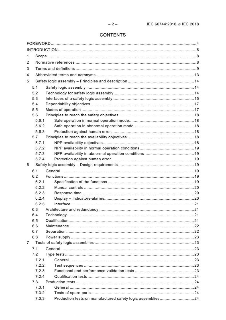IEC 60744:2018 is an international standard established by the International Electrotechnical Commission (IEC) that addresses safety logic assemblies used in nuclear power plants. These assemblies are critical components within safety instrumentation and control systems, specifically for systems performing category A safety functions as defined by IEC 61226. The standard focuses on the characteristics, design requirements, and test methods for safety logic assemblies that provide trip or engineered safety feature actuations through hardwired logic assemblies interfacing with computer-based systems.