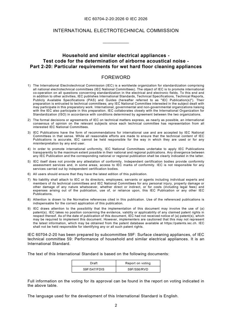 IEC 60704-2-20:2026 specifies the determination of airborne acoustical noise of mains operated and cordless wet hard floor cleaning appliances for household or similar use. In the case of appliances with combined functionality, this document only addresses the wet cleaning functionality. This document does not apply to wet hard floor cleaning appliances for industrial or professional purposes and robotic wet hard floor cleaning appliances. This document is not intended for cleaning appliances according to IEC 60335-2-79, IEC 60704-2-1, IEC 60704-2-17. This document describes the determination of the noise emission of wet hard floor cleaners under normal operating conditions on hard floor in accordance with 4.6 of IEC/ASTM 62885-6:2023. For determining and verifying noise emission values declared in product specifications, see IEC 60704-3. This document is intended to be used in conjunction with IEC 60704 1:2021, Household and similar electrical appliances - Test code for the determination of airborne acoustical noise - Part 1: General requirements.