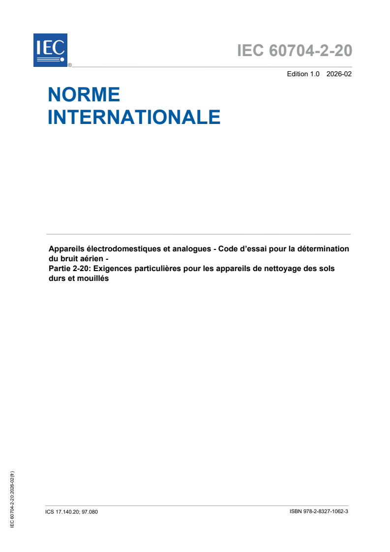 IEC 60704-2-20:2026 is a standard published by the International Electrotechnical Commission (IEC). Its full title is "Household and similar electrical appliances - Test code for the determination of airborne acoustical noise - Part 2-20: Particular requirements for wet hard floor cleaning appliances". This standard covers: IEC 60704-2-20:2026 specifies the determination of airborne acoustical noise of mains operated and cordless wet hard floor cleaning appliances for household or similar use. In the case of appliances with combined functionality, this document only addresses the wet cleaning functionality. This document does not apply to wet hard floor cleaning appliances for industrial or professional purposes and robotic wet hard floor cleaning appliances. This document is not intended for cleaning appliances according to IEC 60335-2-79, IEC 60704-2-1, IEC 60704-2-17. This document describes the determination of the noise emission of wet hard floor cleaners under normal operating conditions on hard floor in accordance with 4.6 of IEC/ASTM 62885-6:2023. For determining and verifying noise emission values declared in product specifications, see IEC 60704-3. This document is intended to be used in conjunction with IEC 60704 1:2021, Household and similar electrical appliances - Test code for the determination of airborne acoustical noise - Part 1: General requirements.