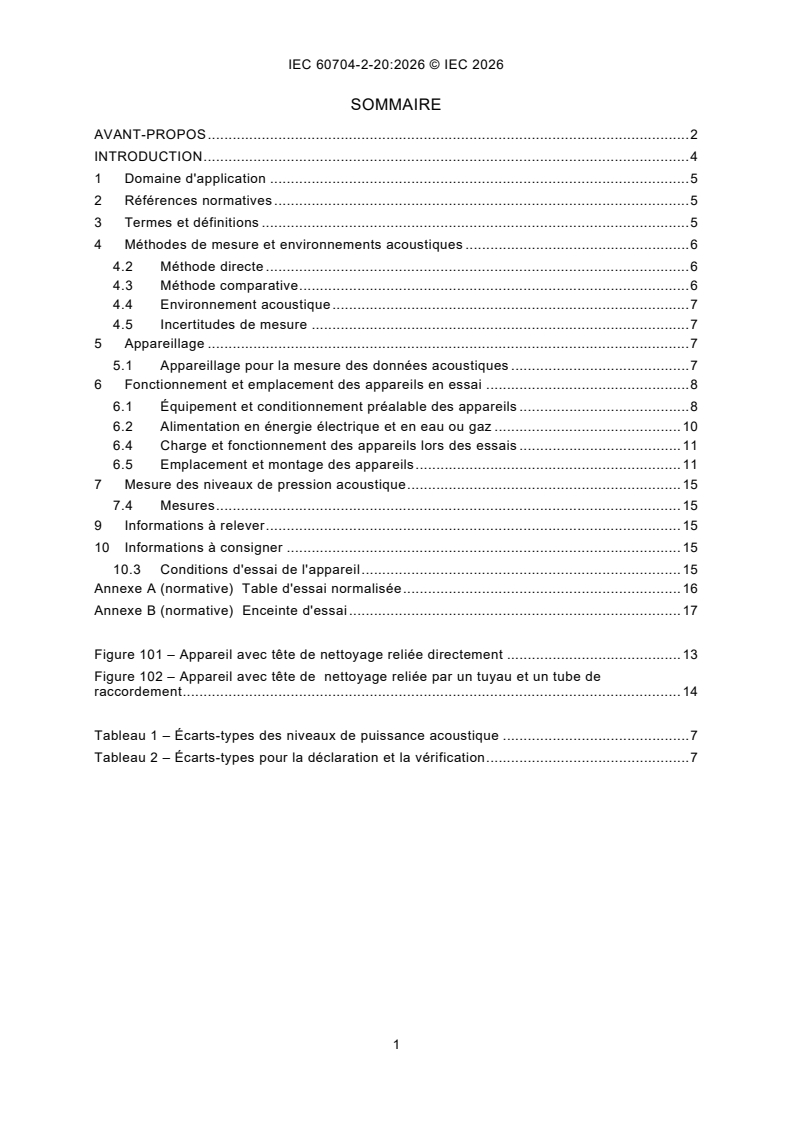 L'IEC 60704-2-20:2026 spécifie la méthode utilisée pour déterminer le bruit aérien émis par les appareils de nettoyage des sols durs et mouillés à usage domestique ou analogue sur secteur et sans cordon. Dans le cas des appareils dont les fonctions sont combinées, le présent document traite uniquement de la fonction de nettoyage par voie humide. Le présent document ne s'applique pas aux appareils de nettoyage des sols durs et mouillés destinés à des usages industriels ou professionnels ni aux appareils de nettoyage des sols durs et mouillés robotisés. Le présent document n'est pas destiné aux appareils de nettoyage selon l'IEC 60335-2-79, l'IEC 60704-2-1 et l'IEC 60704-2-17. Le présent document décrit la méthode utilisée pour déterminer le bruit émis par des appareils de nettoyage des sols durs et mouillés qui fonctionnent dans les conditions normales d'utilisation sur un sol dur conformément au 4.6 de l'IEC/ASTM 62885-6:2023. Pour la détermination et la vérification des valeurs d'émission sonore déclarées dans les spécifications du produit, voir l'IEC 60704-3. Le présent document est destiné à être utilisé conjointement avec l'IEC 60704-1:2021, Appareils électrodomestiques et analogues - Code d'essai pour la détermination du bruit aérien - Partie 1: Exigences générales.