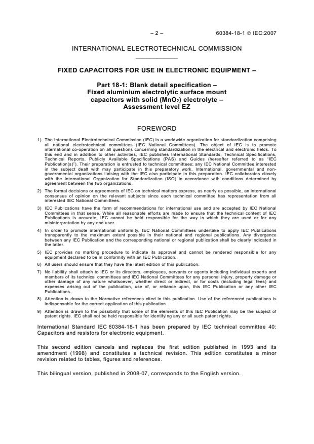 IEC 60384-18-1:2007 is a standard published by the International Electrotechnical Commission (IEC). Its full title is "Fixed capacitors for use in electronic equipment - Part 18-1: Blank detail specification - Fixed aluminium electrolytic surface mount capacitors with solid (MnO<sub>2</sub>) electrolyte - Assessment level EZ". This standard covers: IEC 60384-18-1:2007 is a blank detail specification and is a supplementary document to the sectional specification and contains requirements for style, layout and minimum content of detail specifications. Detail specifications not complying with these requirements may not be considered as being in accordance with IEC specifications nor shall they so be described. This second edition cancels and replaces the first edition published in 1993 and its amendment (1998) and constitutes a technical revision. This edition constitutes a minor revision related to tables, figures and references.